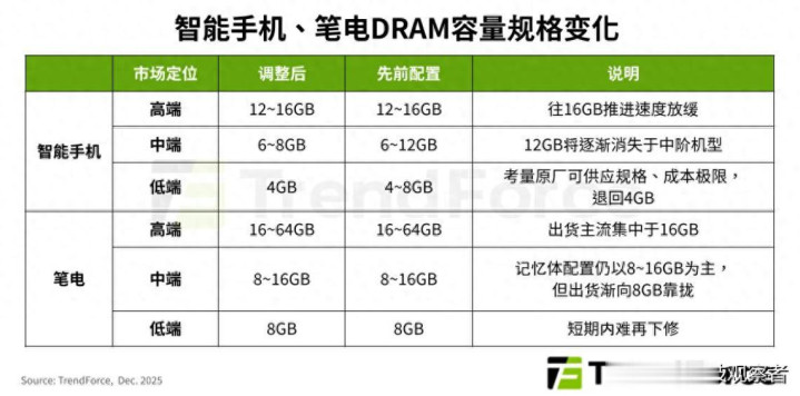 TrendForce集邦咨询指出,“缩减规格配置”或“暂缓升级”已成智能手机、笔电品牌平衡成本的一项必要手段,其中以成本占比较高的DRAM修正较明显。预料高阶、中阶产品的DRAM容量规格将分别向该市场的最低标准集中,放缓提升速度。至于低阶市场则是受创最深的价格带,以手机为例,2026年退回以4GB为主;低价笔电因受限于处理器搭配及操作系统需求,DRAM配置短期内难再下修。